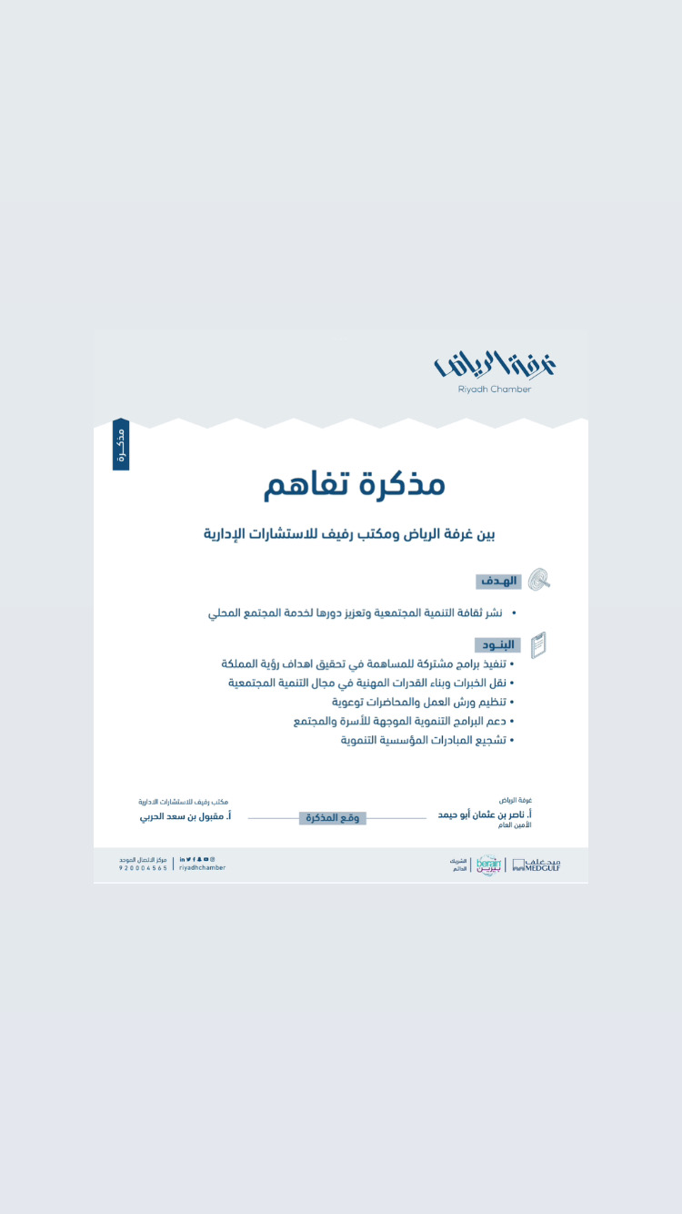 توقيع مذكرة تفاهم بين شركة رفيف للاستشارات الإدارية وغرفة الرياض.